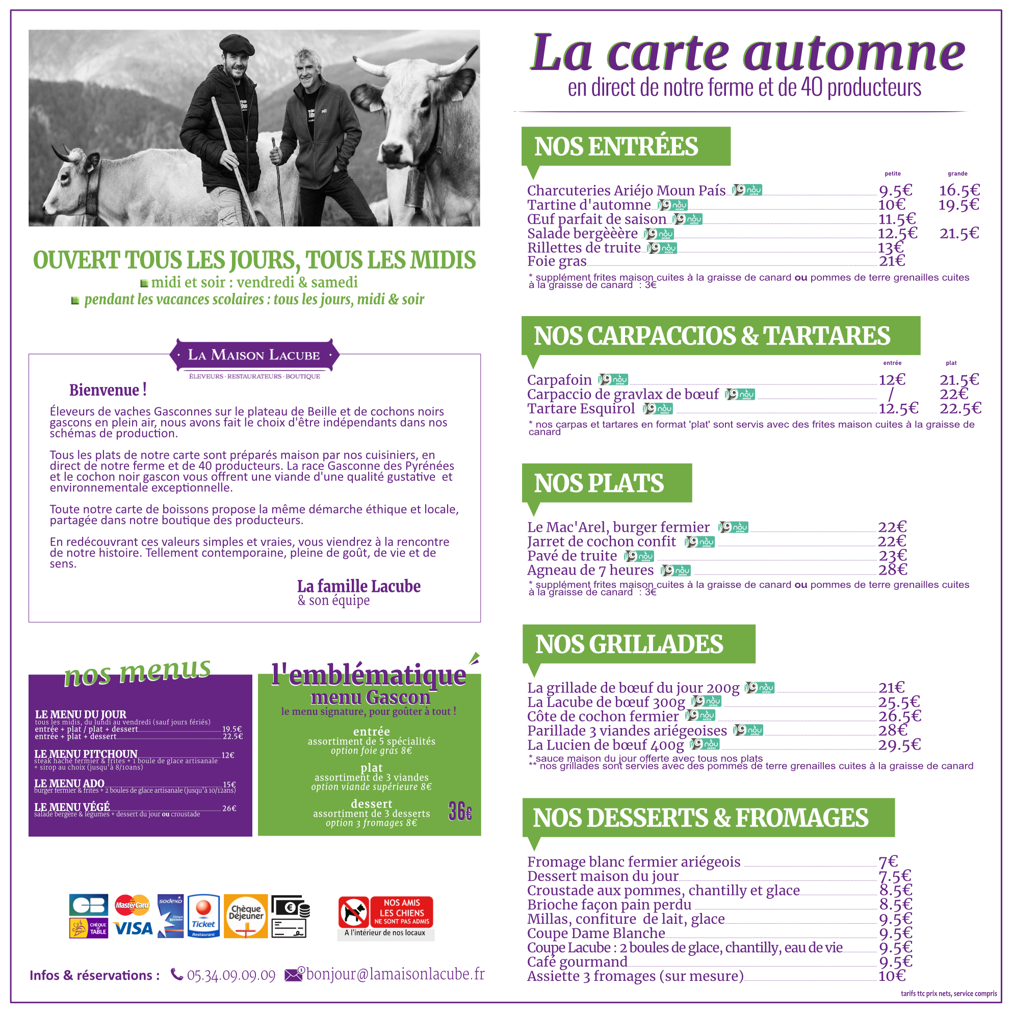 Tous nos menus et notre carte sont cuisinés maison à partir de viandes et produits frais en direct de notre ferme et de 40 producteurs en circuit-court. Toutes les viandes servies chez nous sont garanties 100% Ariège et proviennent de notre ferme et des fermes voisines. Faites votre choix dans le menu parmi les délicieuses recettes de nos cuisiniers, inspirées par les trouvailles gustatives dénichées patiemment chez les producteurs et artisans Ariégeois.